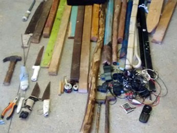 Foram encontradas armas artesanais e barrotes de madeira durante a vistoria.