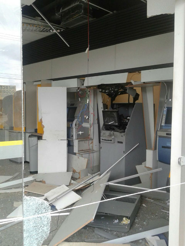 Na ação, os bandidos chegaram a explodir uma das máquinas de autoatendimento, causando estragos em parte do teto. Uma das vidraças também foi atingida pelo impacto da explosão e ficou estilhaçada.